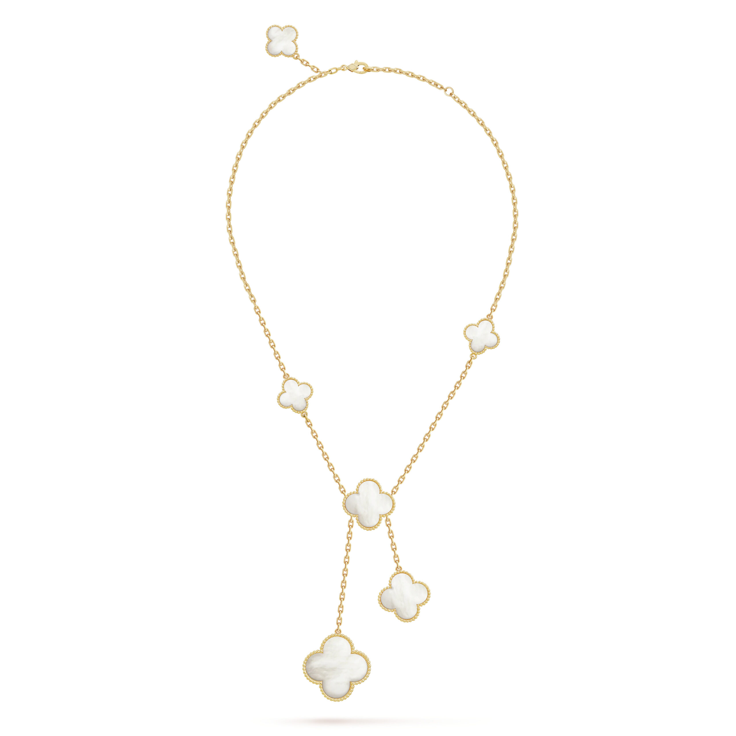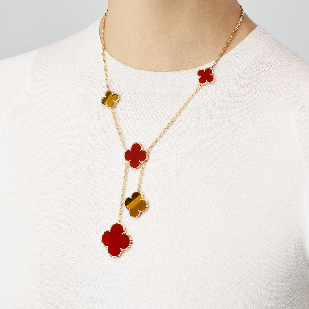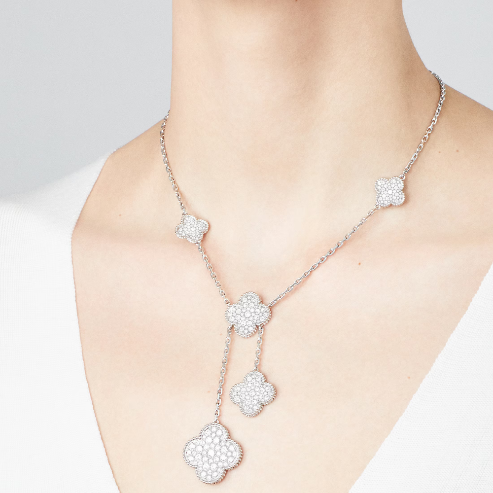 This clover Y-shaped necklace features a refined, elongated silhouette accented with multiple clover motifs, creating a balanced and elegant design.