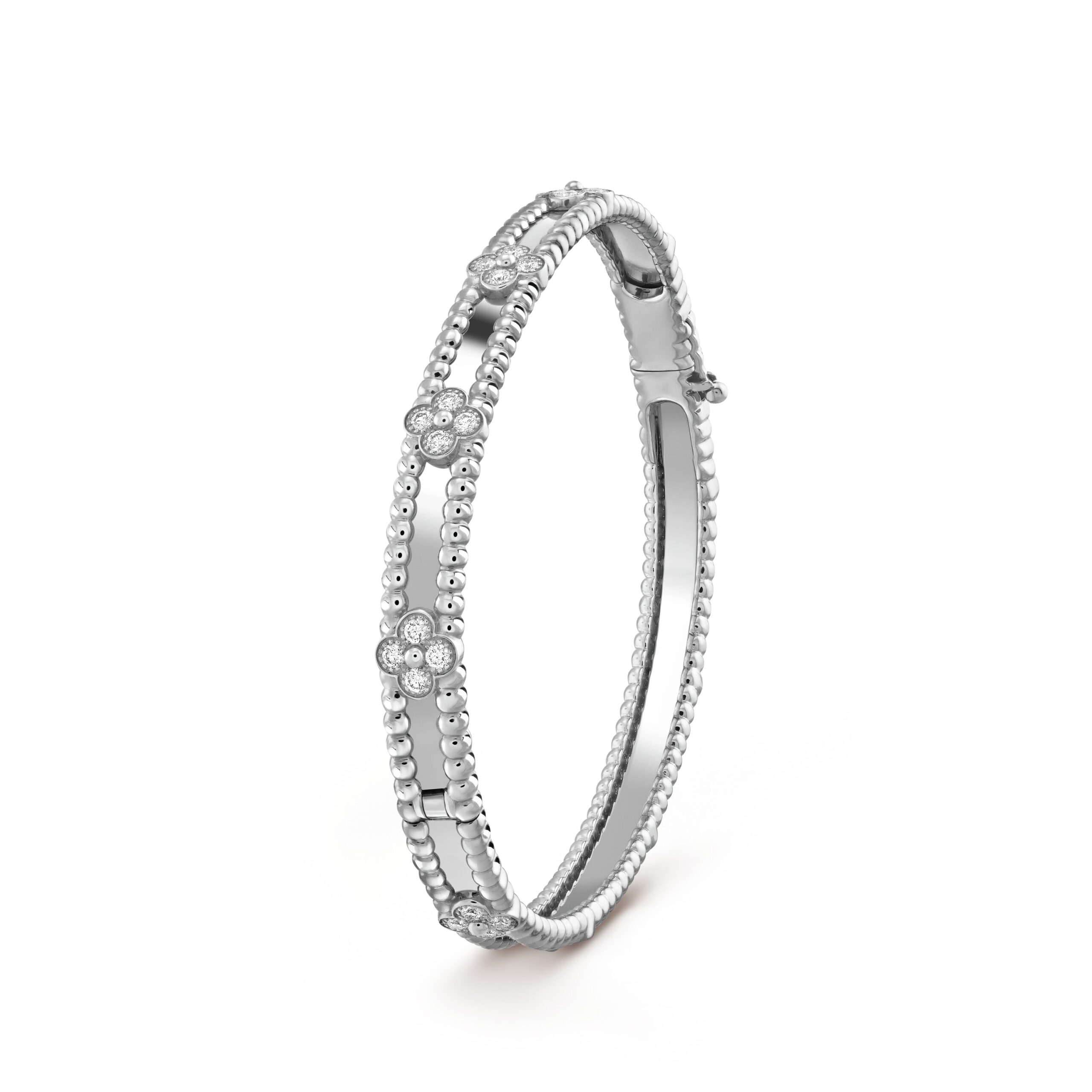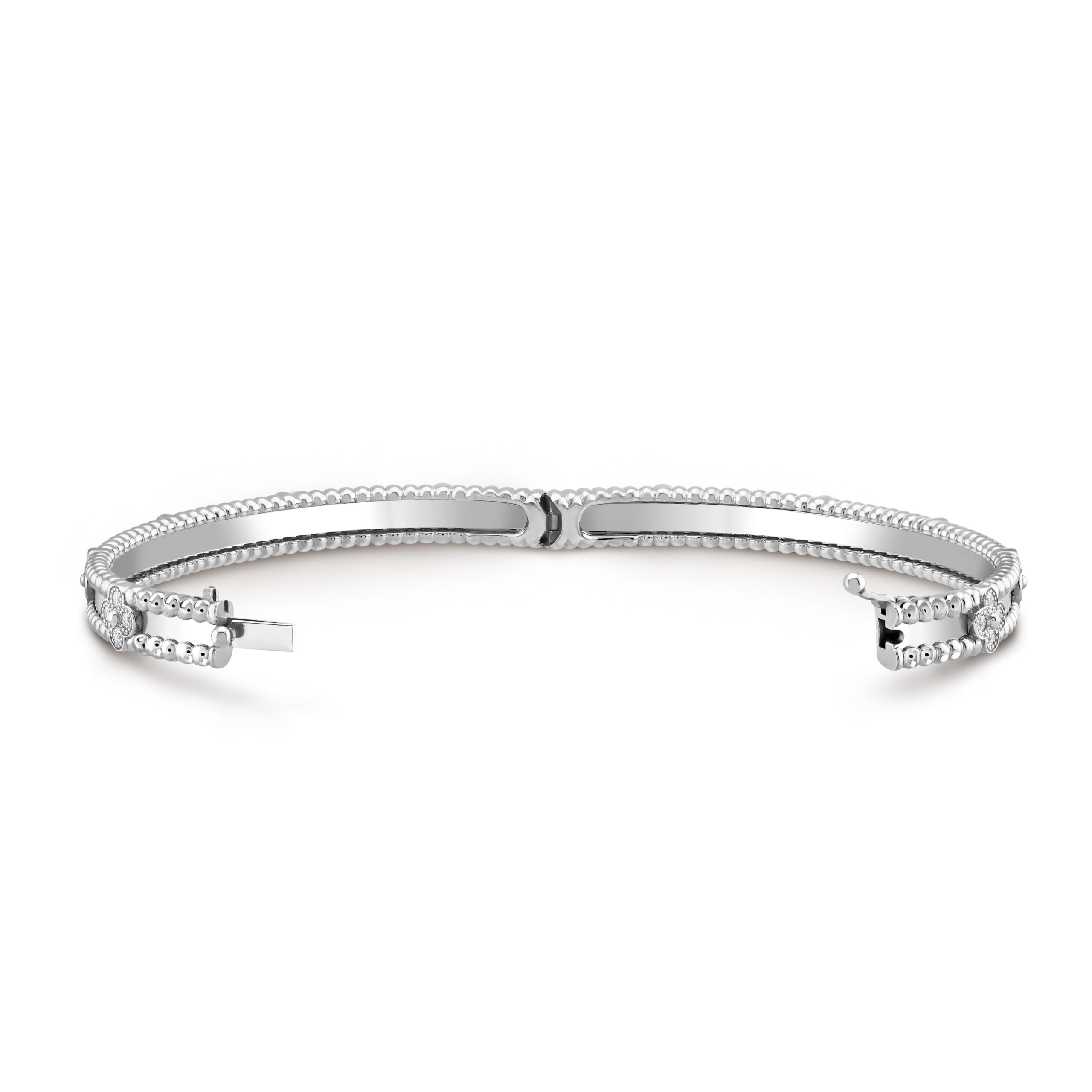 This elegant floral motif bangle bracelet features a refined decorative design accented with sparkling cubic zirconia, creating a graceful and polished look.