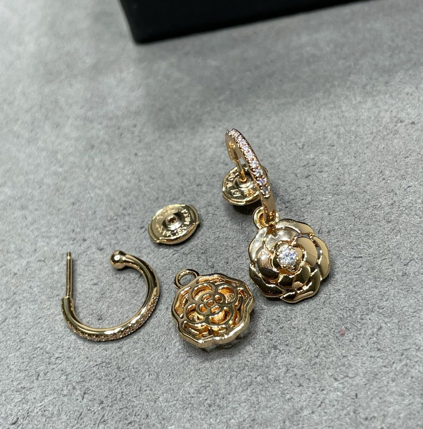 18K gold-plated floral motif drop earrings with cubic zirconia accents. Lightweight and elegant.