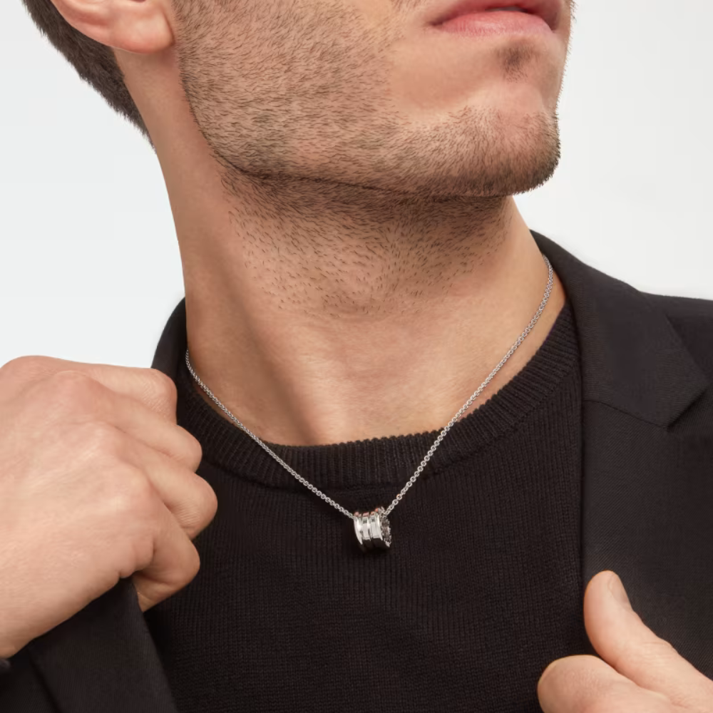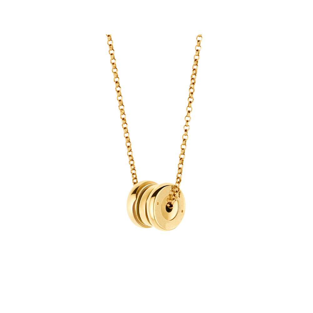 The elegant dual-ring pendant creates a modern, versatile look, paired with an adjustable 14.96–17.70 inch chain for a comfortable and flexible fit.