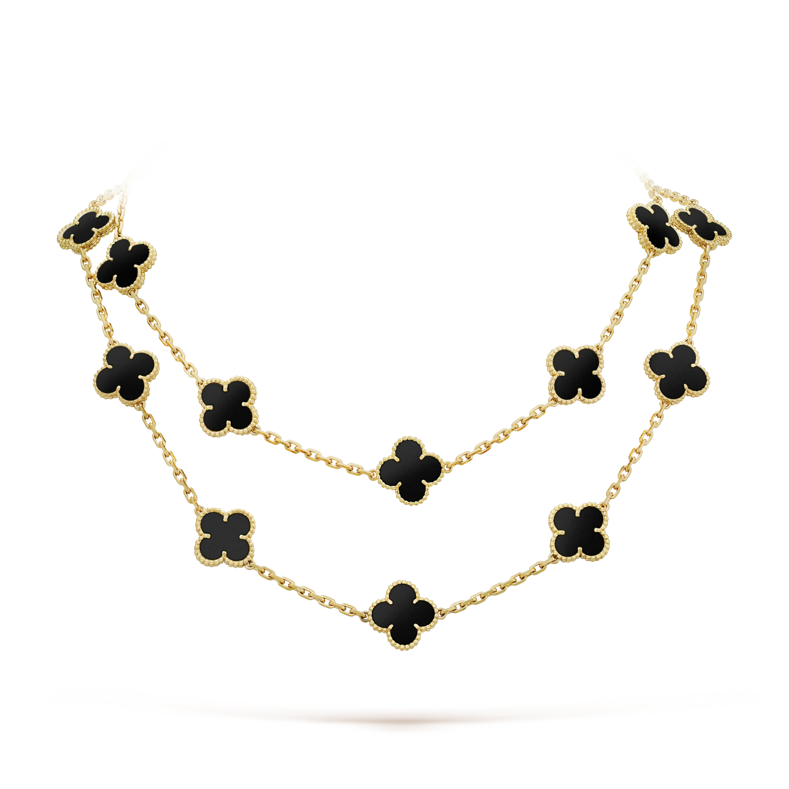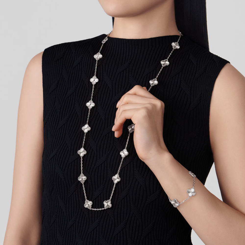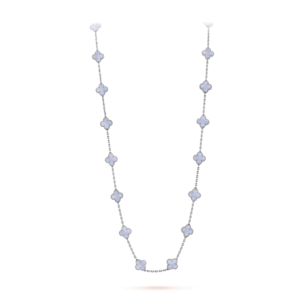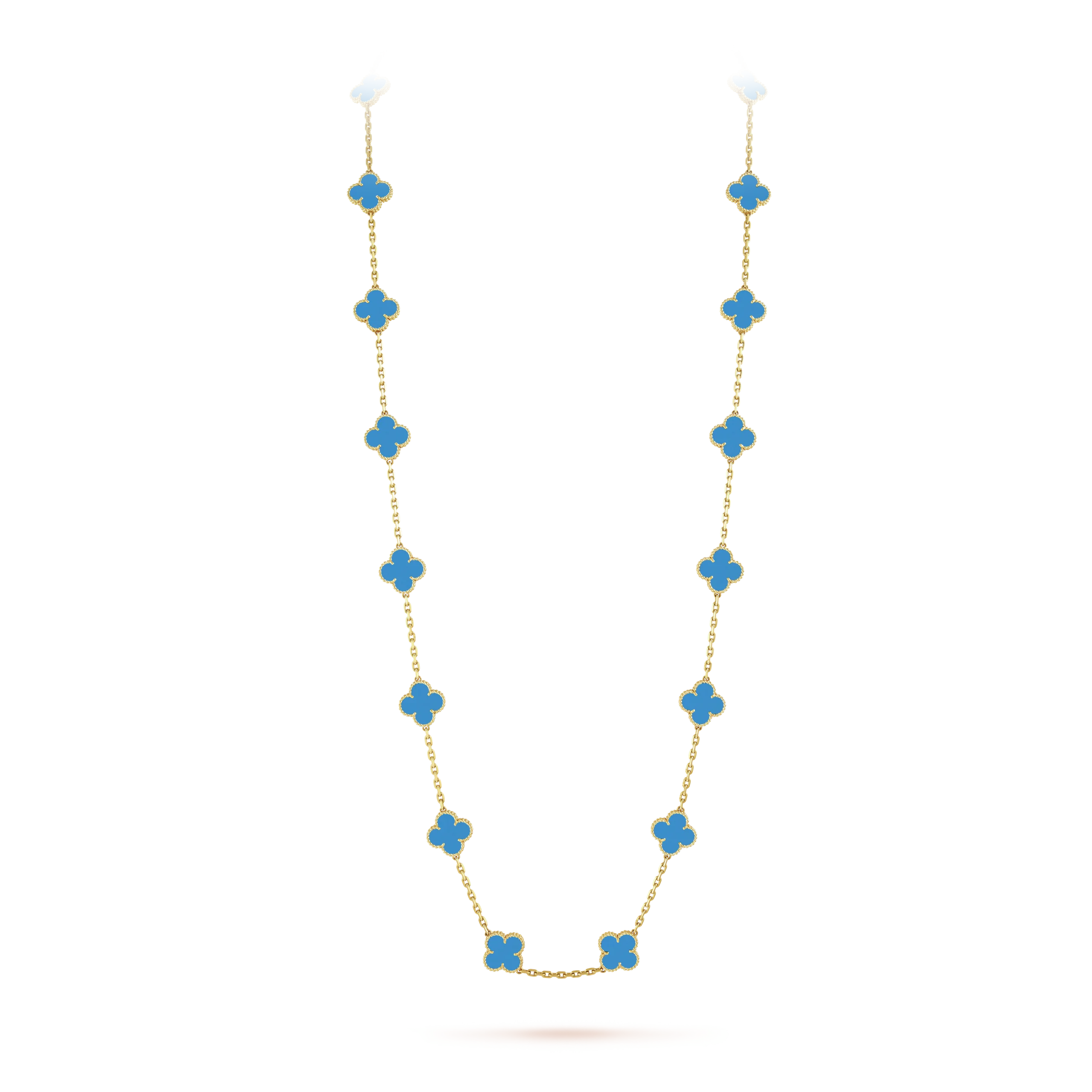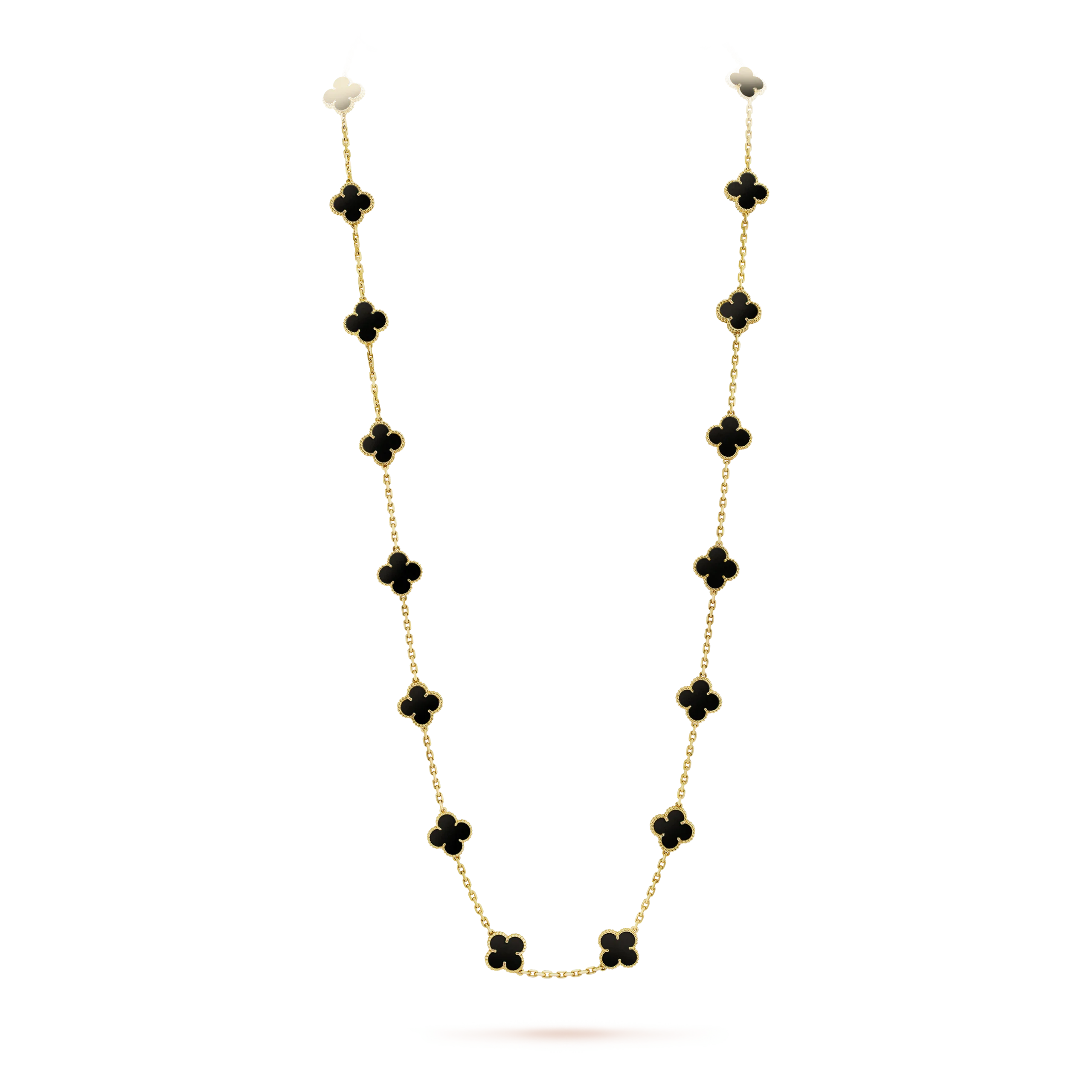 This elegant multi-motif long necklace features a series of refined symbolic motifs arranged along an elongated chain, creating a graceful and luxurious layered effect.