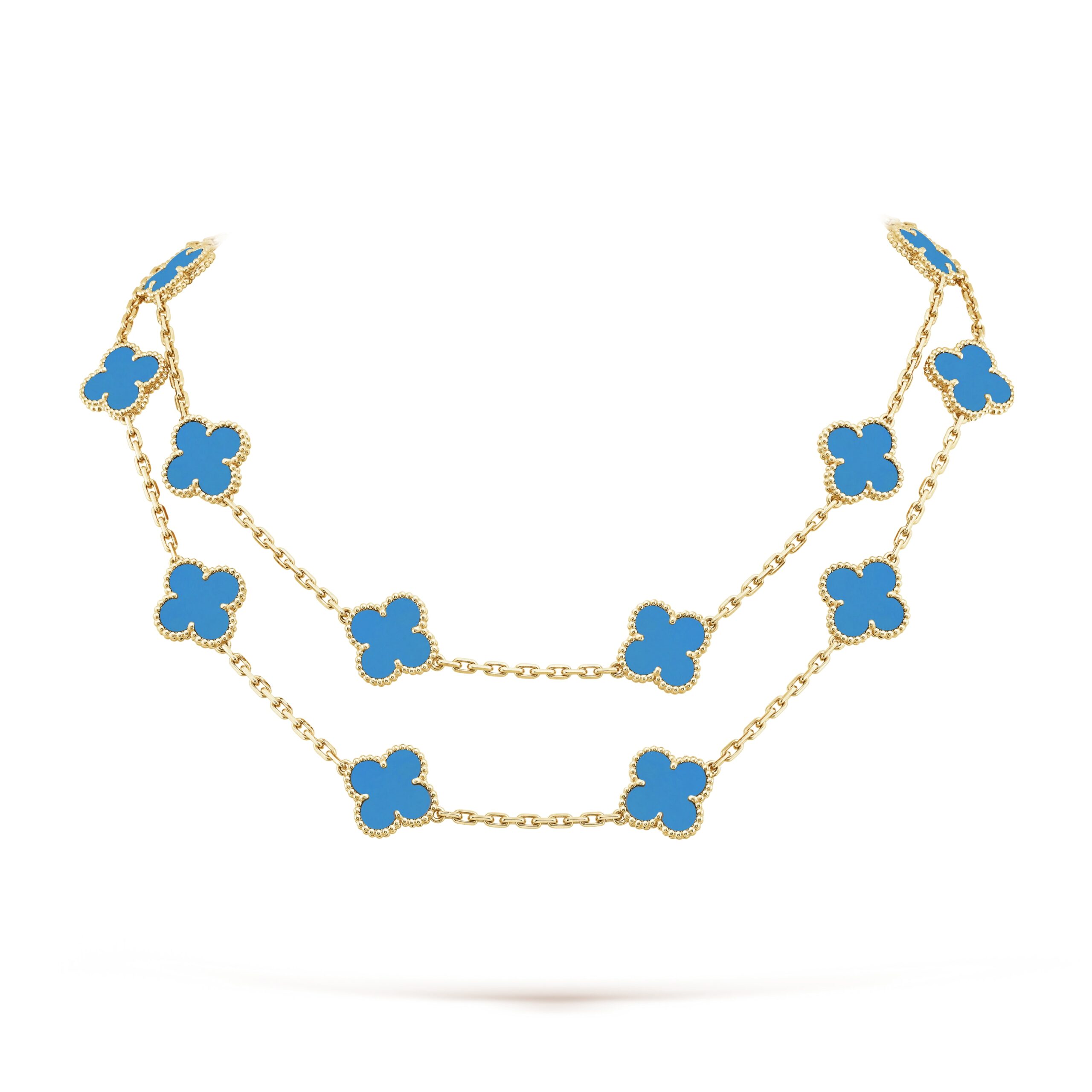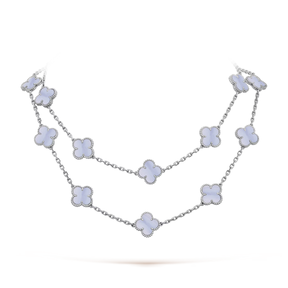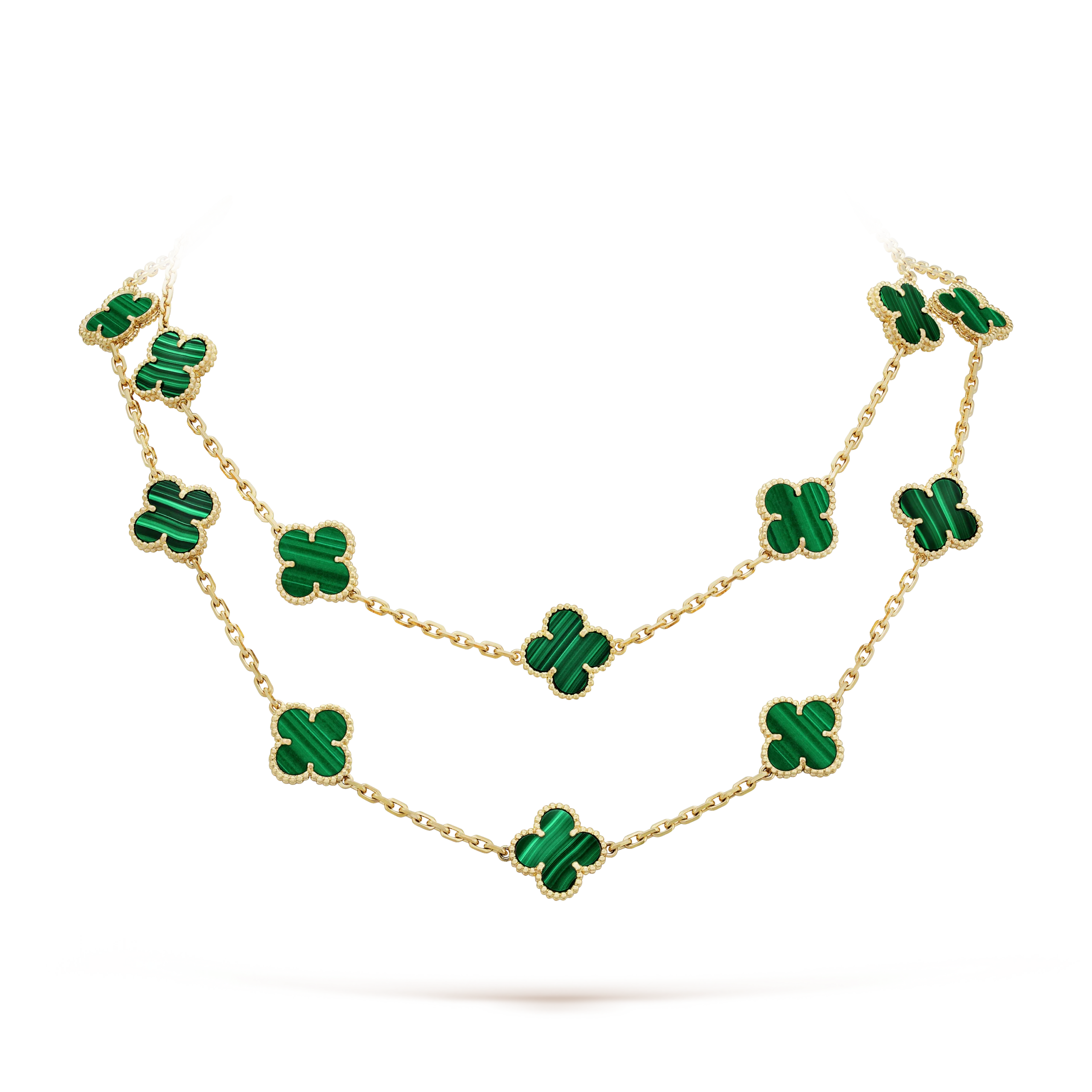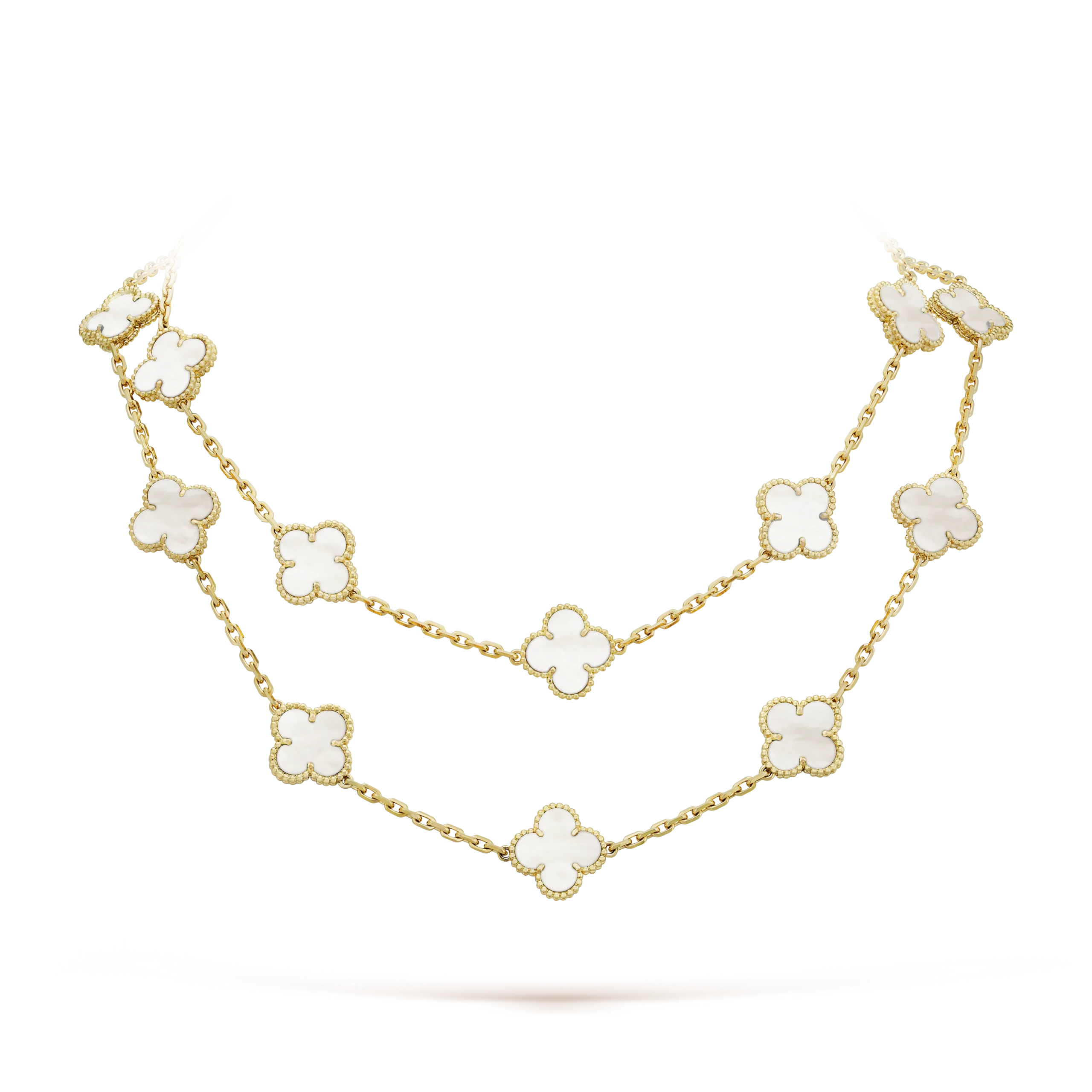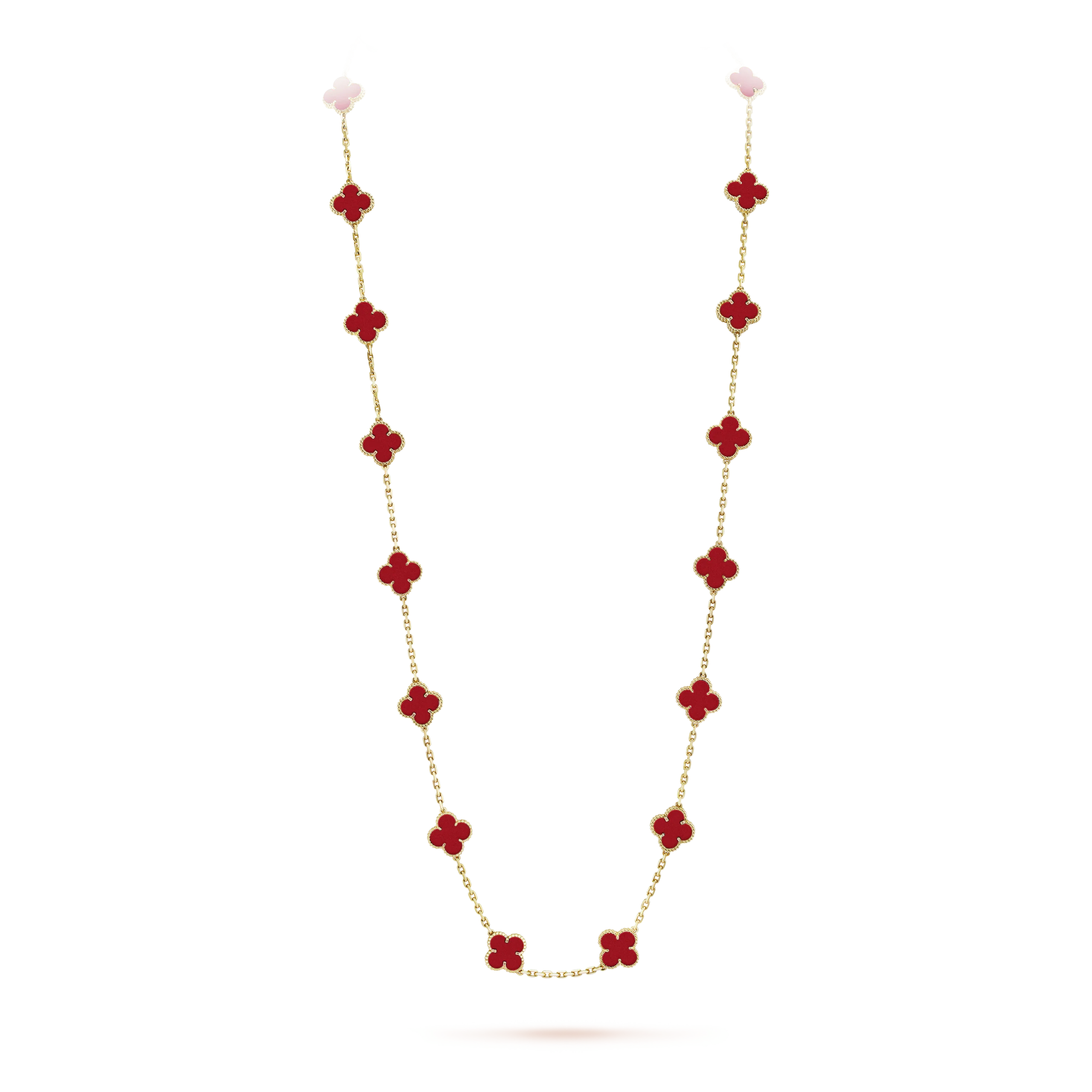 This elegant multi-motif long necklace features a series of refined symbolic motifs arranged along an elongated chain, creating a graceful and luxurious layered effect.